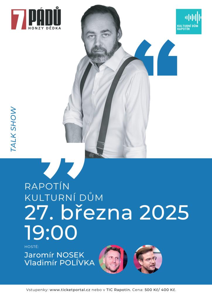 Populární talk show 7 pádů Honzy Dědka míří k nám do kulturního domu, kde se můžete těšit na dvě hodiny zábavy se známými herci a to Jaromírem Nosekem a Vladimírem Polívkou.
