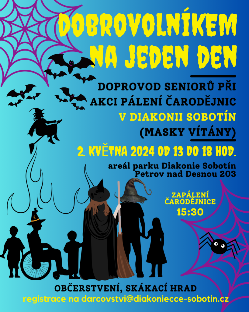Ve čtvrtek 2. května připravujeme akci Pálení čarodějnic, na kterou hledáme pomocníky/dobrovolníky, jež by nám pomohli s doprovodem seniorů, tedy pomocí s svrchním oblékáním, obouváním, přesunem na zahradu, opékáním špekáčků atd.