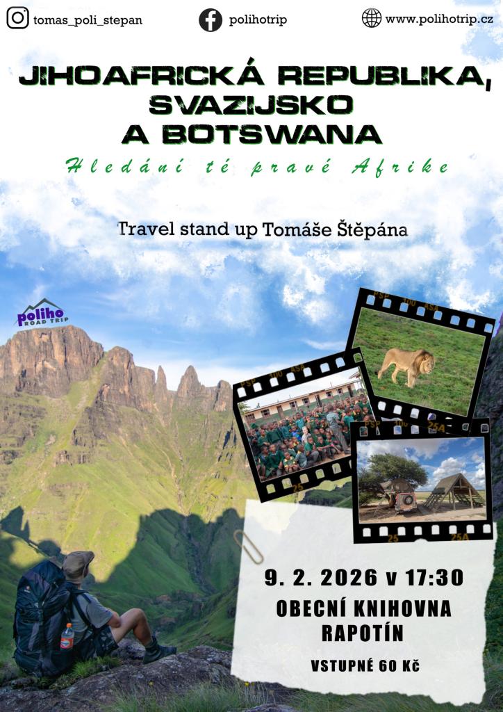 Cestovatelská beseda s fotografem, průvodcem a dobrodruhem Tomášem Štěpánem vás zavede do srdce Afriky. Čekají vás Divoké Dračí hory, safari v Centrální Kalahari s vozem 4×4, návštěva vesnické školy i potápění s velkým bílým žralokem. Autentické zážitky, fotografie a osobní postřehy z cest po „pravé Africe“, o které snil už od dětství.