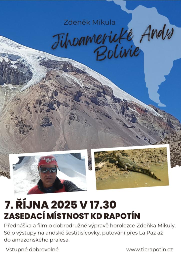 Vydejte se se Zdeňkem Mikulou do jihoamerických And! Společně navštívíme oblast jezera Titicaca a uslyšíme o náročných výstupech na ledové vrcholy Alpamayo a Teriju. Poté se přesuneme do národního parku Sajama, kde Mikula zdolal nejvyšší horu Bolívie Sajamu (6 548 m) – a to zcela sólo, bez průvodců a nosičů.